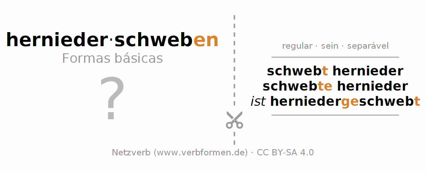 Instruções: Imprimir e recortar os flashcards do verbo herniederschweben. Em seguida, misture os diversos cartões. Retire um deles. As informações devem ser memorizadas. Para verificar a resposta utilize as informações nas fichas de aprendizagem.
