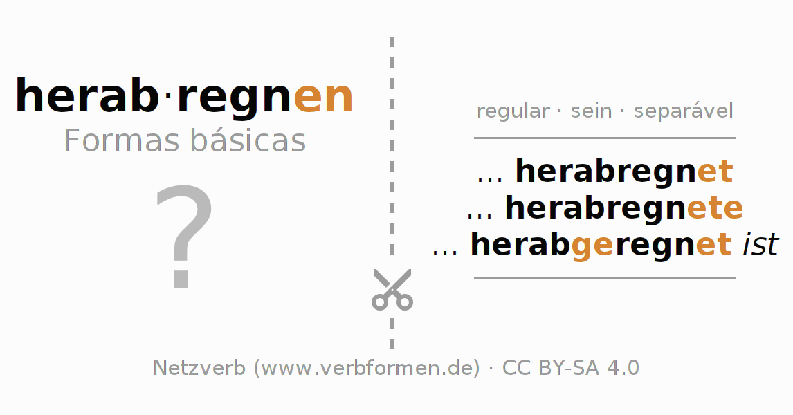 Com os flashcards, a conjugação dos verbos em alemão pode-se aprender e treinar. Para fazer isso, siga as tarefas nas folhas de aprendizado do verbo herabregnen. As formas verbais devem ser resolvidas de cabeça. Posteriormente são comparadas com as informações nos cartões. Se concordar, você confirma seu resultado de aprendizado. Se houver um erro, você deve utilizar as informações para memorizar os cartões desconhecidos. Normalmente, imprima o arquivo em PDF dos cartões de aprendizagem e dobre-os conforme especificado. Poderá então colocá-los em uma pilha com outros verbos que deseja aprender. Há também muitas outras planilhas planilhas para o verbo herabregnen. Todo o material está disponível nos Recursos Educacionais Abertos (OER) sob licença CC BY-SA 4.0 e pode ser usado gratuitamente.