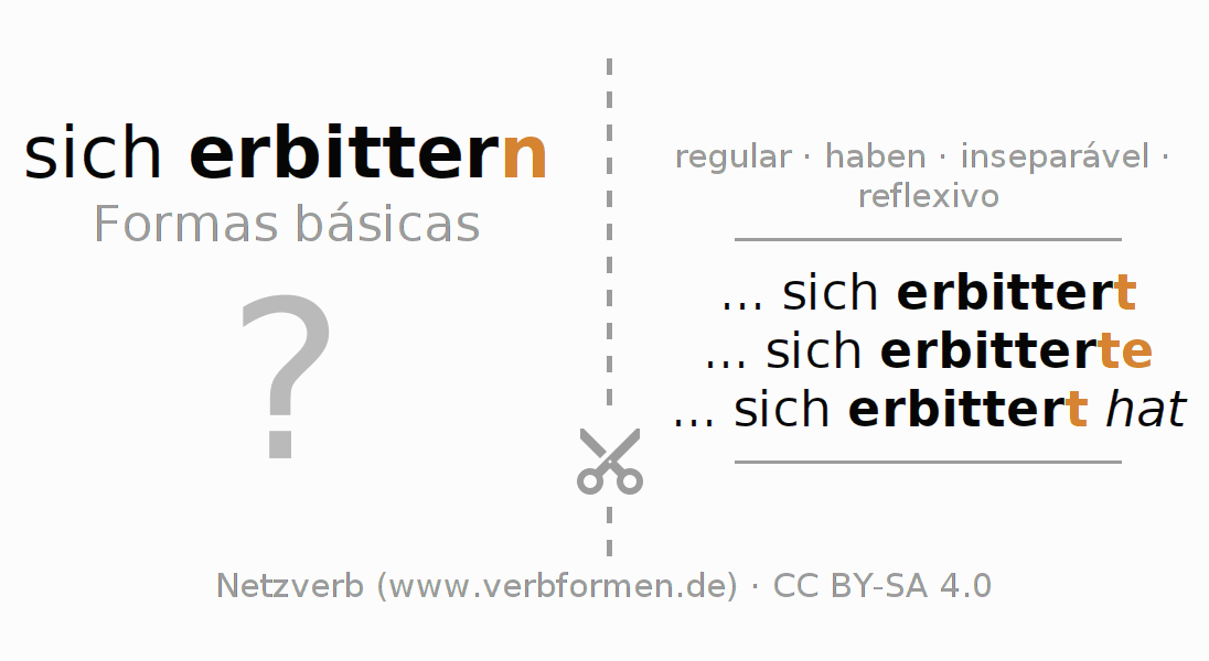Instruções: Imprimir e recortar os flashcards do verbo sich erbittern. Em seguida, misture os diversos cartões. Retire um deles. As informações devem ser memorizadas. Para verificar a resposta utilize as informações nas fichas de aprendizagem.