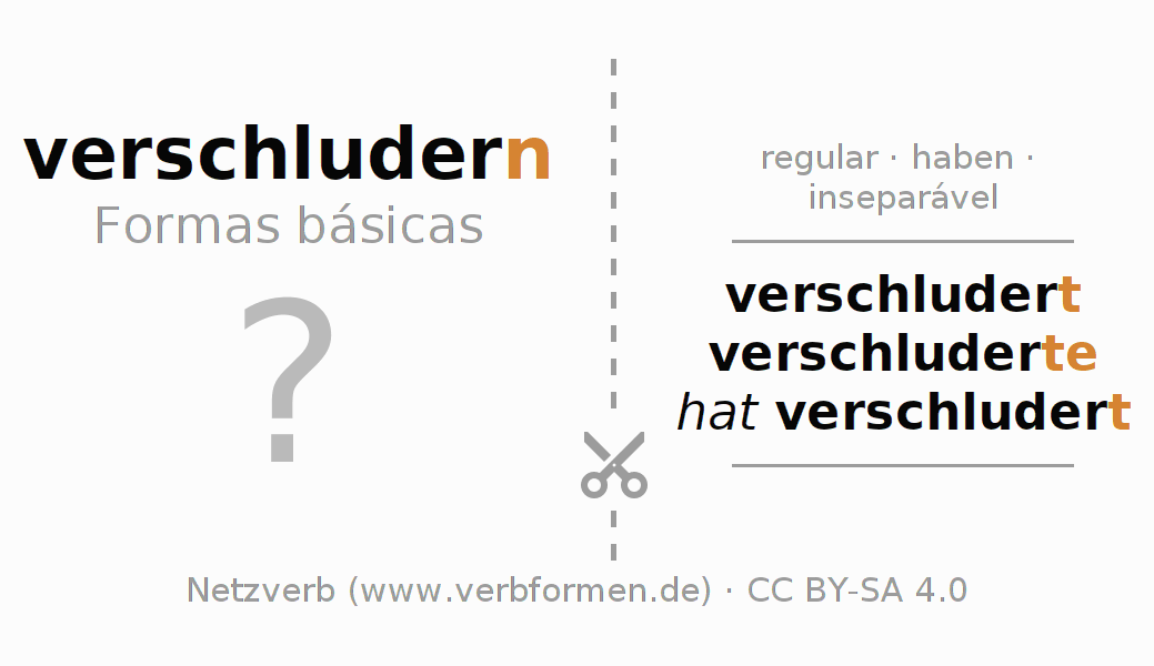Com os flashcards, a conjugação dos verbos em alemão pode-se aprender e treinar. Para fazer isso, siga as tarefas nas folhas de aprendizado do verbo verschludern. As formas verbais devem ser resolvidas de cabeça. Posteriormente são comparadas com as informações nos cartões. Se concordar, você confirma seu resultado de aprendizado. Se houver um erro, você deve utilizar as informações para memorizar os cartões desconhecidos. Normalmente, imprima o arquivo em PDF dos cartões de aprendizagem e dobre-os conforme especificado. Poderá então colocá-los em uma pilha com outros verbos que deseja aprender. Há também muitas outras planilhas planilhas para o verbo verschludern. Todo o material está disponível nos Recursos Educacionais Abertos (OER) sob licença CC BY-SA 4.0 e pode ser usado gratuitamente.