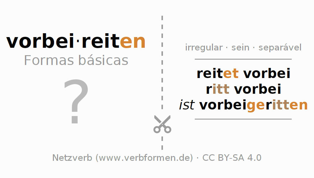 Instruções: Imprimir e recortar os flashcards do verbo vorbeireiten. Em seguida, misture os diversos cartões. Retire um deles. As informações devem ser memorizadas. Para verificar a resposta utilize as informações nas fichas de aprendizagem.