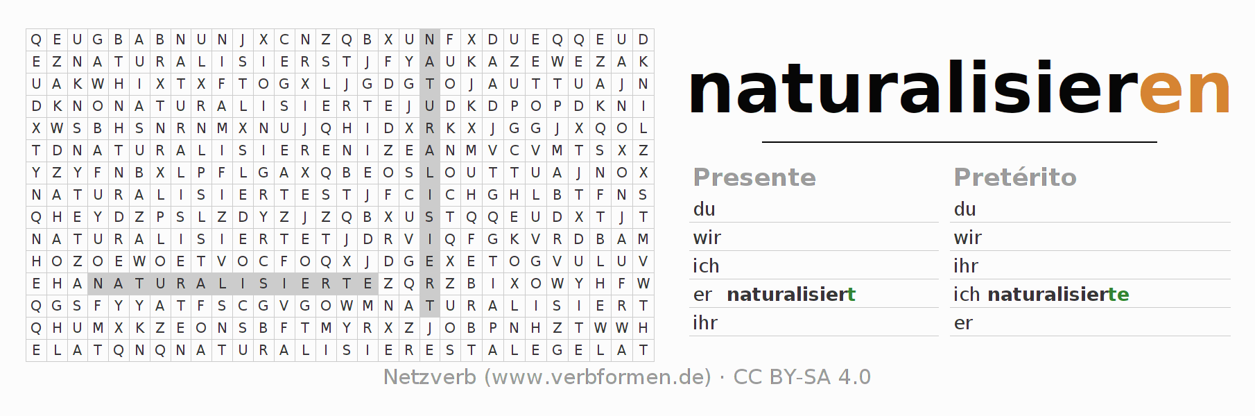 Com o caça-palavras aprende-se de uma forma desafiadora a conjugação do verbo naturalisieren.