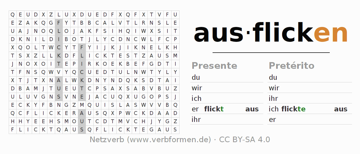 Com o caça-palavras aprende-se de uma forma desafiadora a conjugação do verbo ausflicken.