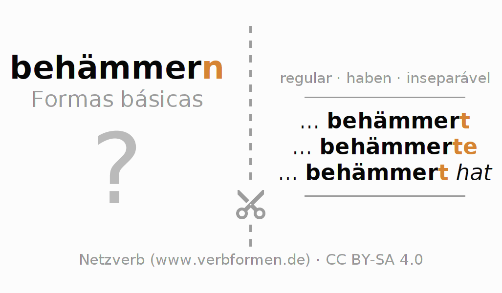 A Tabela de verbo resume todas as formas verbais do verbo behämmern em uma só tabela.