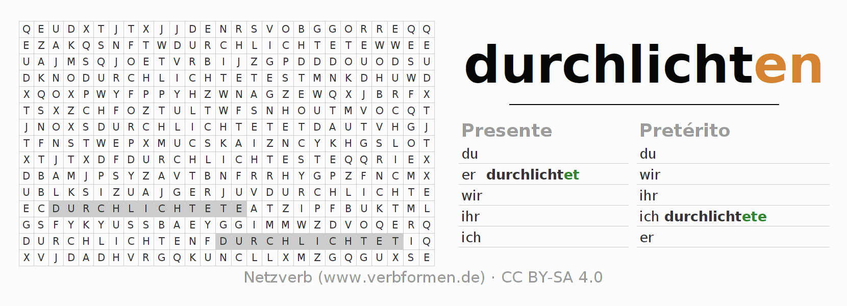 Caça-palavras para todas as formas do verbo durchlichten