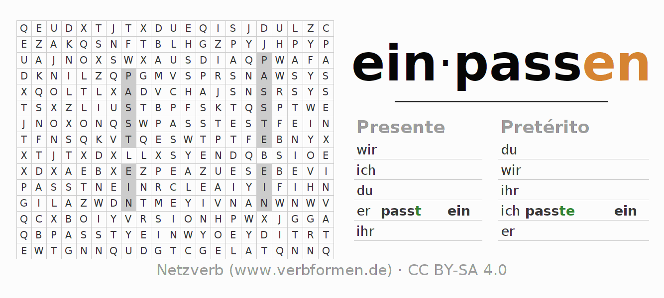 Caça-palavras para todas as formas do verbo einpassen