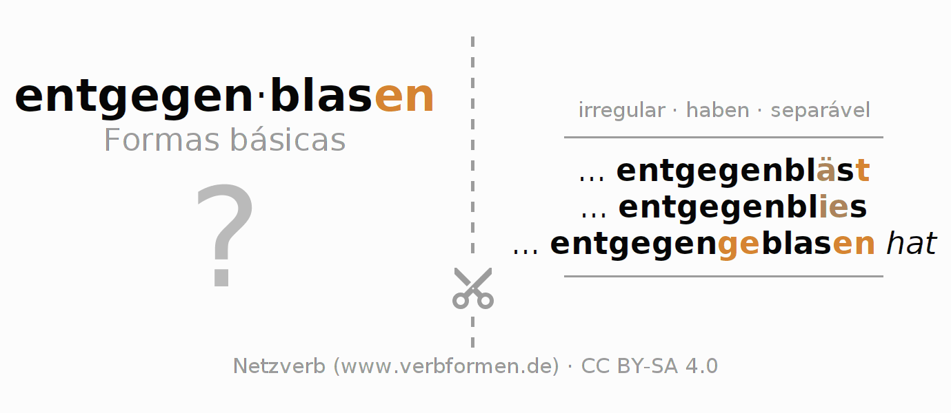 A Tabela de verbo resume todas as formas verbais do verbo entgegenblasen em uma só tabela.