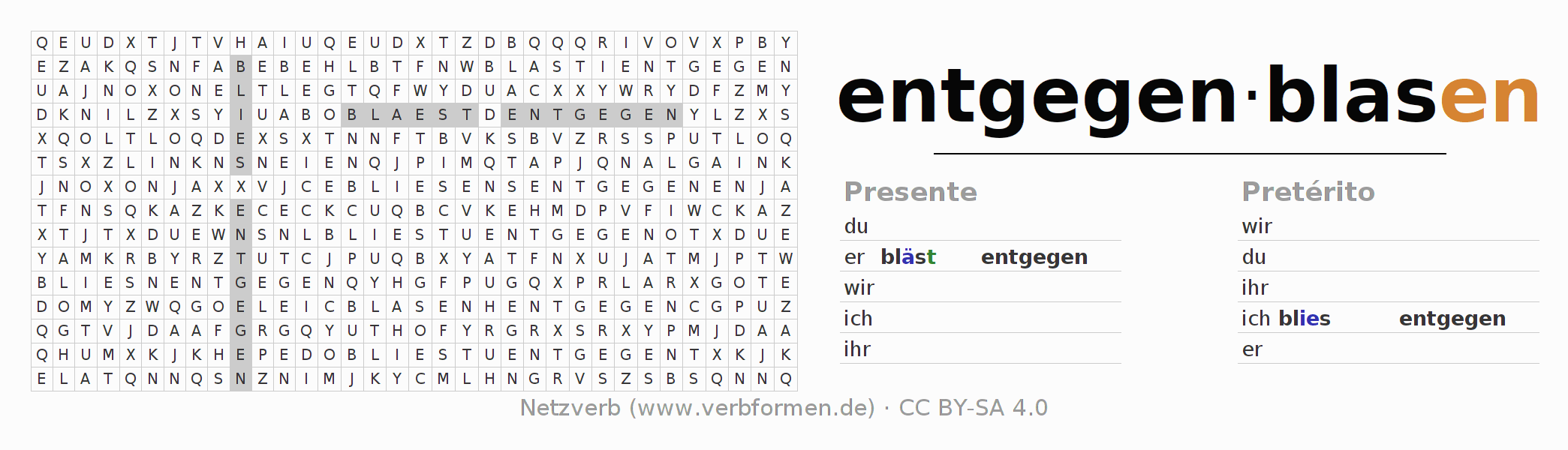 Caça-palavras para todas as formas do verbo entgegenblasen
