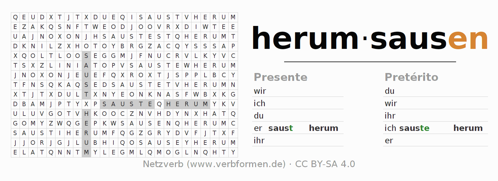 Com o caça-palavras aprende-se de uma forma desafiadora a conjugação do verbo herumsausen.