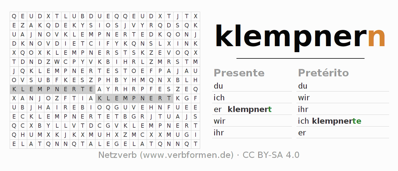 Com o caça-palavras aprende-se de uma forma desafiadora a conjugação do verbo klempnern.