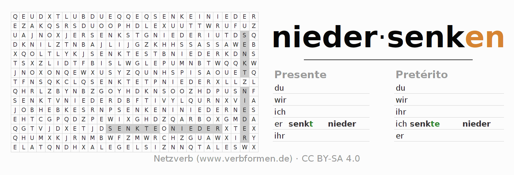 Com o caça-palavras aprende-se de uma forma desafiadora a conjugação do verbo niedersenken.