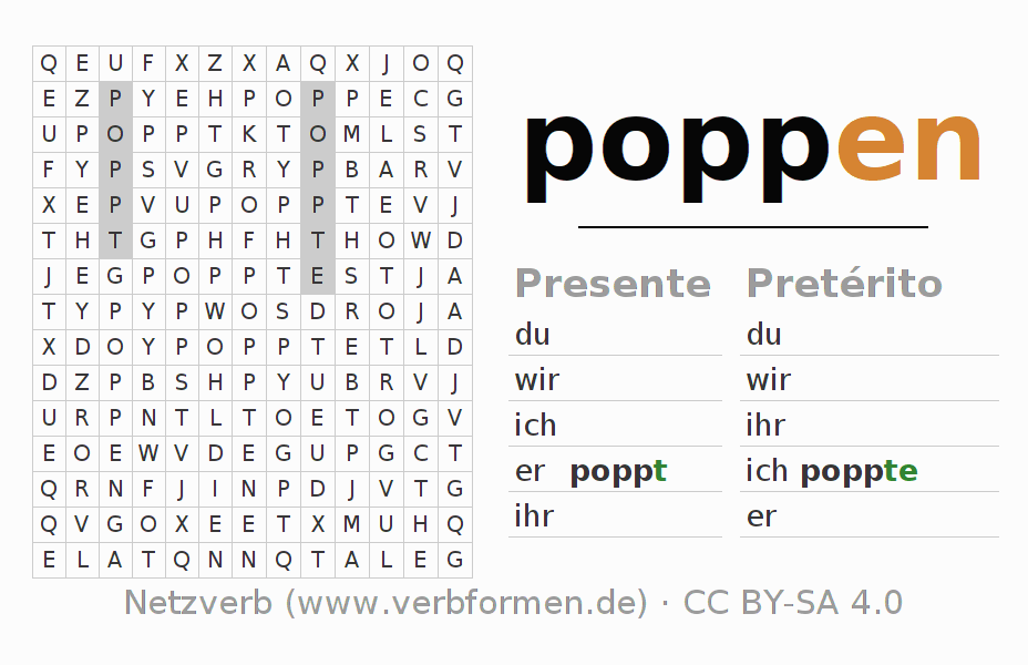 As planilhas são geralmente usadas no ensino para a Conjugação do verbo poppen. Os materiais podem ser utilizados como Recursos Educacionais Abertos (OER) em exercícios, jogos e tarefas (CC BY-SA 4.0). Existem diferentes tipos de tarefas disponíveis para o verbo poppen. Há uma variedade de execícios com uma visão geral e completa da conjugação como por exemplo, caça-palavras e jogos que requerem um aprendizado em conjunto. Todo o material educacional está disponível gratuitamente para download como PDF, como imagem e através uma versão interativa do navegador. Além das tarefas, inúmeros exemplos do verbo poppen também auxiliam na utilização do verbo.