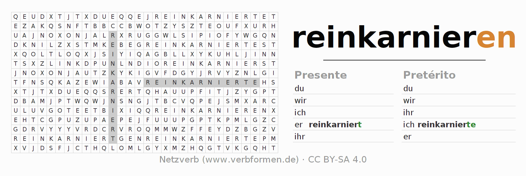 Caça-palavras para todas as formas do verbo reinkarnieren