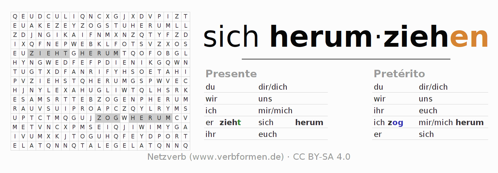 Caça-palavras para todas as formas do verbo sich herumziehen (hat)