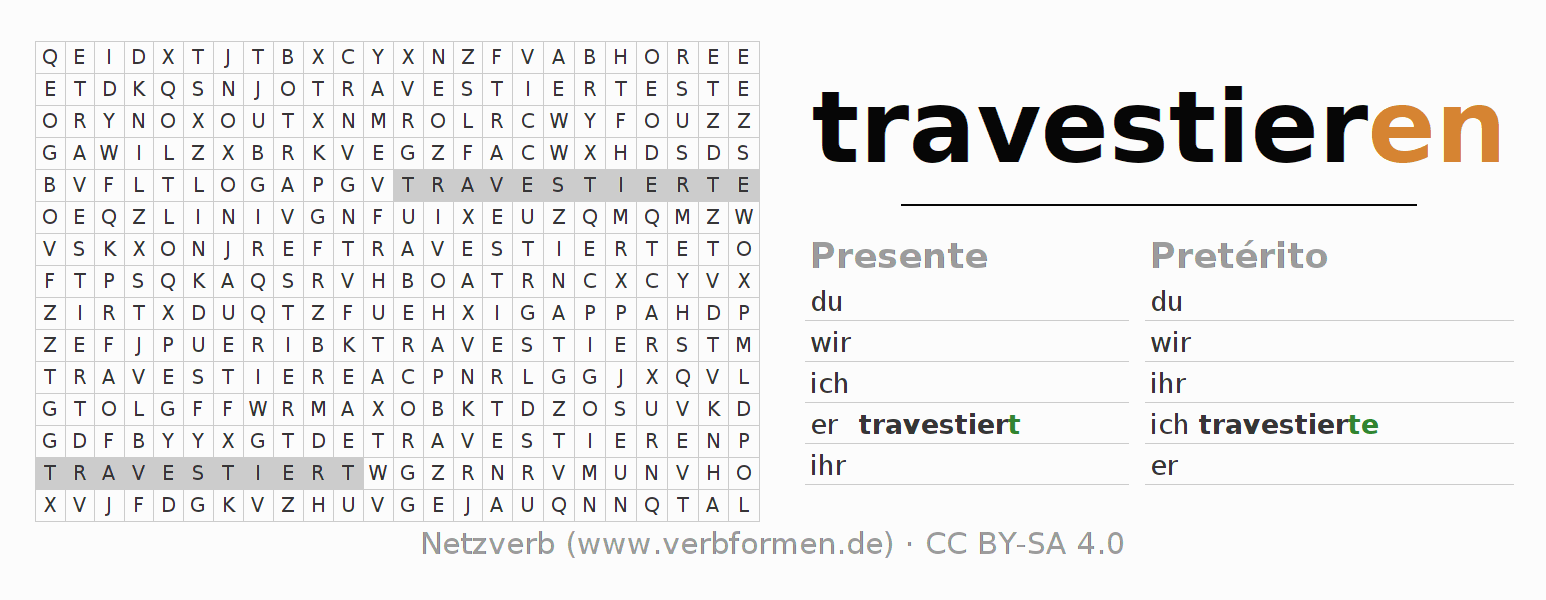 Com o caça-palavras aprende-se de uma forma desafiadora a conjugação do verbo travestieren.