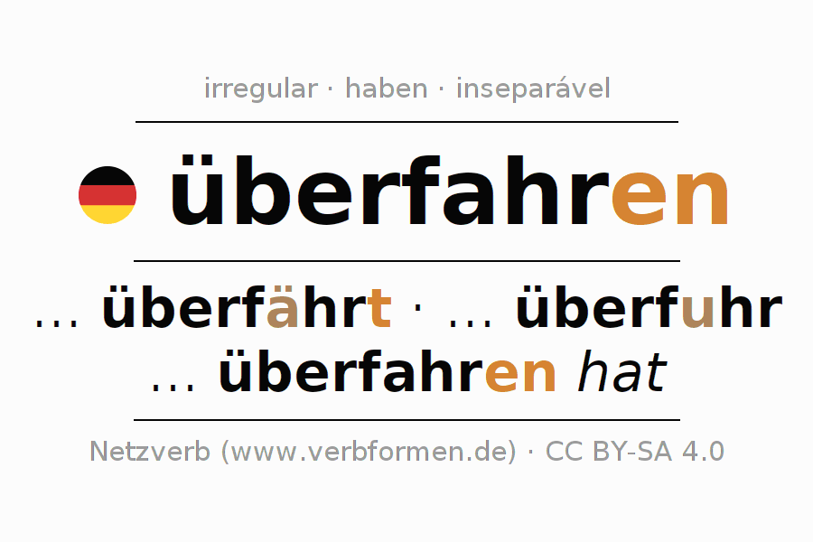 A Tabela de verbo resume todas as formas verbais do verbo überfahren em uma só tabela.