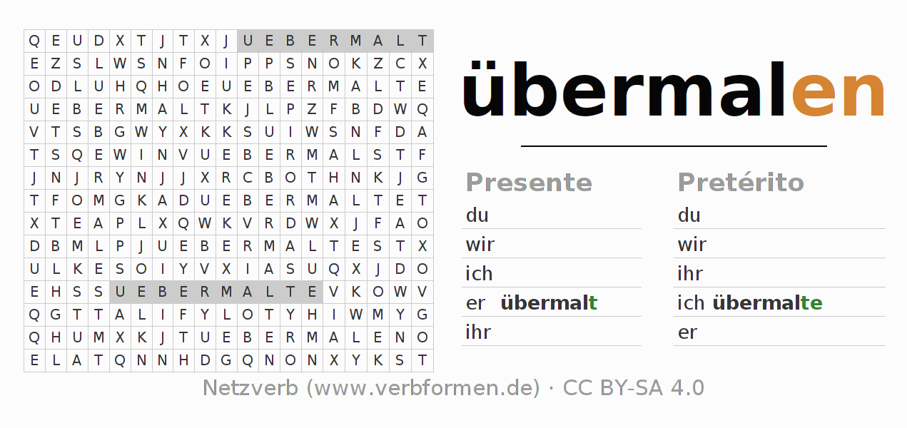 As planilhas são geralmente usadas no ensino para a Conjugação do verbo übermalen. Os materiais podem ser utilizados como Recursos Educacionais Abertos (OER) em exercícios, jogos e tarefas (CC BY-SA 4.0). Existem diferentes tipos de tarefas disponíveis para o verbo übermalen. Há uma variedade de execícios com uma visão geral e completa da conjugação como por exemplo, caça-palavras e jogos que requerem um aprendizado em conjunto. Todo o material educacional está disponível gratuitamente para download como PDF, como imagem e através uma versão interativa do navegador. Além das tarefas, inúmeros exemplos do verbo übermalen também auxiliam na utilização do verbo.