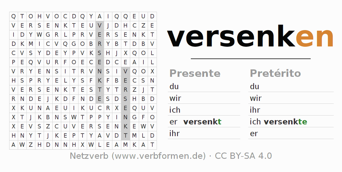 Com o caça-palavras aprende-se de uma forma desafiadora a conjugação do verbo versenken.
