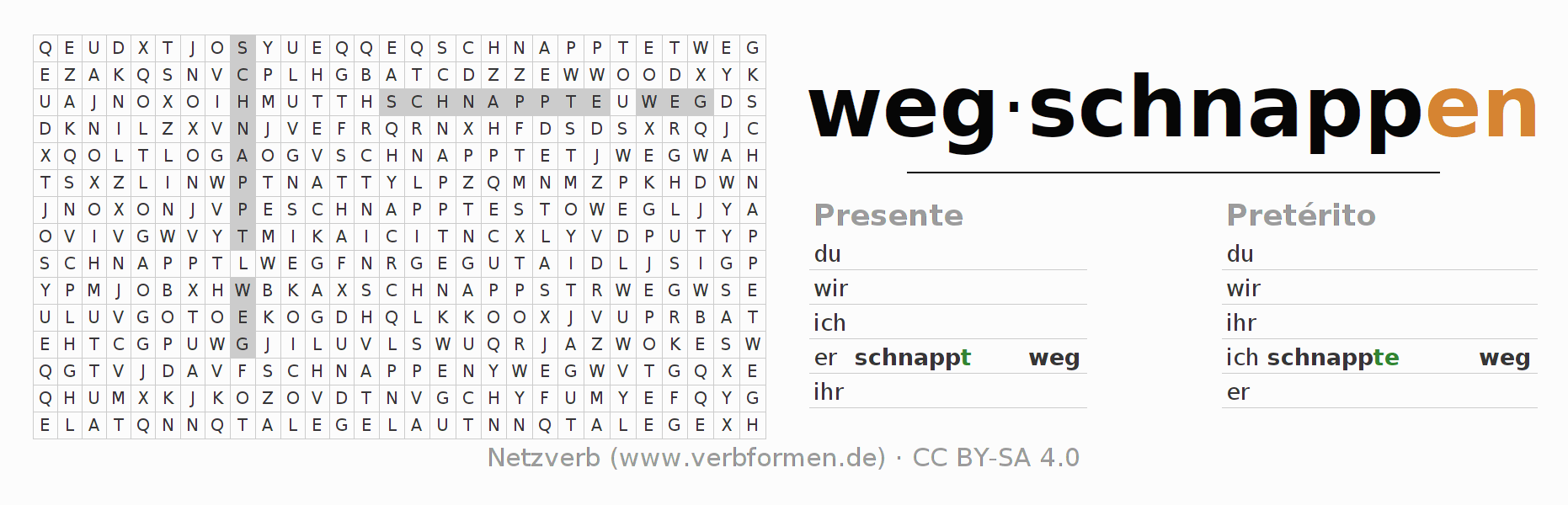 Com o caça-palavras aprende-se de uma forma desafiadora a conjugação do verbo wegschnappen.