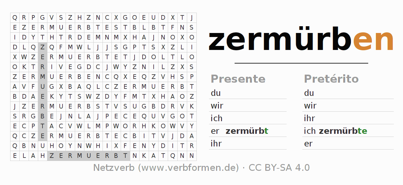 Caça-palavras para todas as formas do verbo zermürben