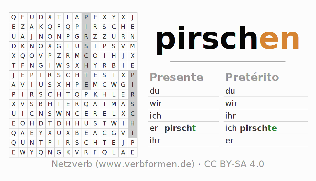 Com o caça-palavras aprende-se de uma forma desafiadora a conjugação do verbo pirschen.