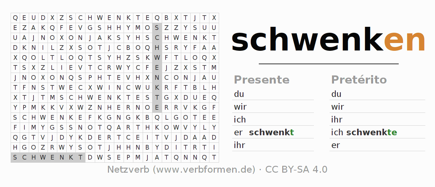 Com o caça-palavras aprende-se de uma forma desafiadora a conjugação do verbo schwenken.