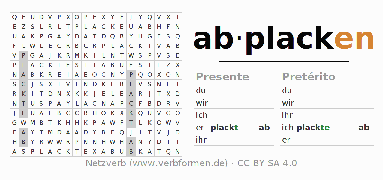 Solução do caça-palavras para a conjugação do verbo abplacken
