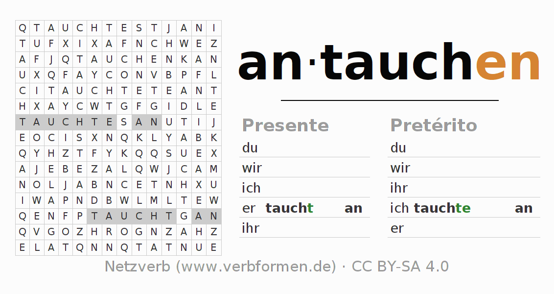 Instruções: reconhecer as formas verbais do verbo antauchen e encontrá-las no caça-palavras. Ou reconhecer a forma flexionada do verbo antauchen e atribuir a forma verbal correta. Trema e ß estão escritos como oe, ae, ue e ss.A solução encontra-se no final da página.