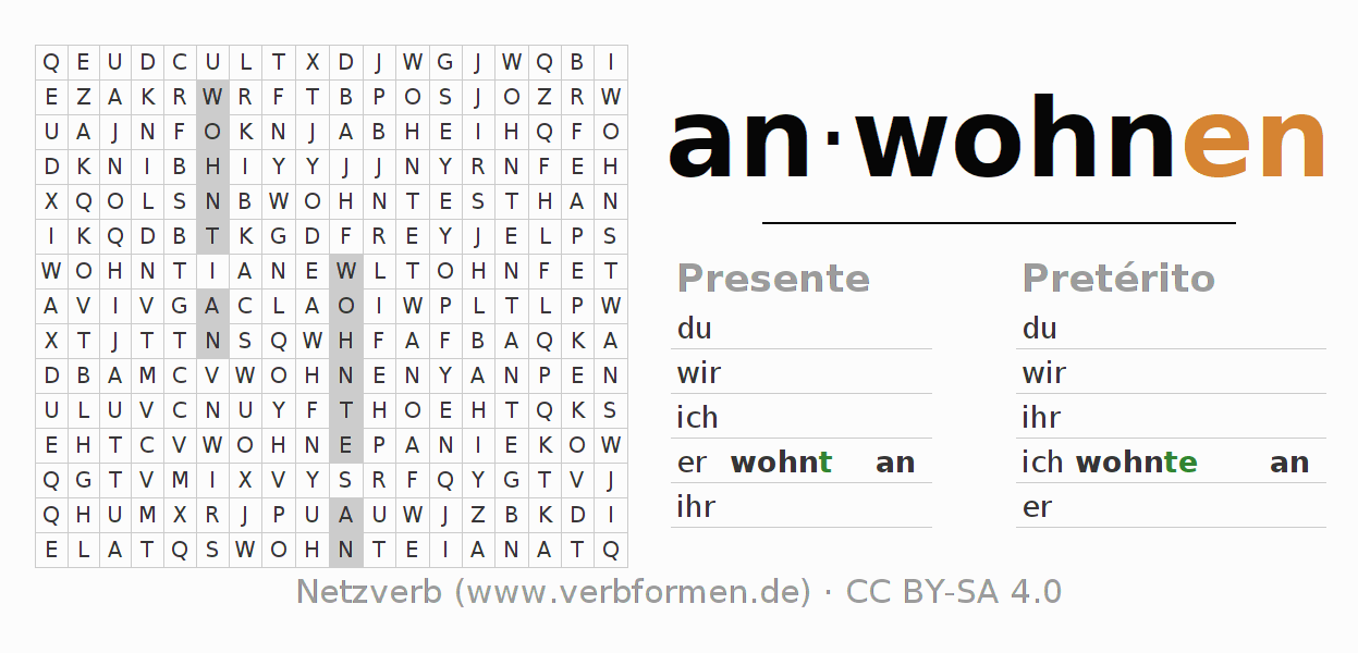 Solução do caça-palavras para a conjugação do verbo anwohnen