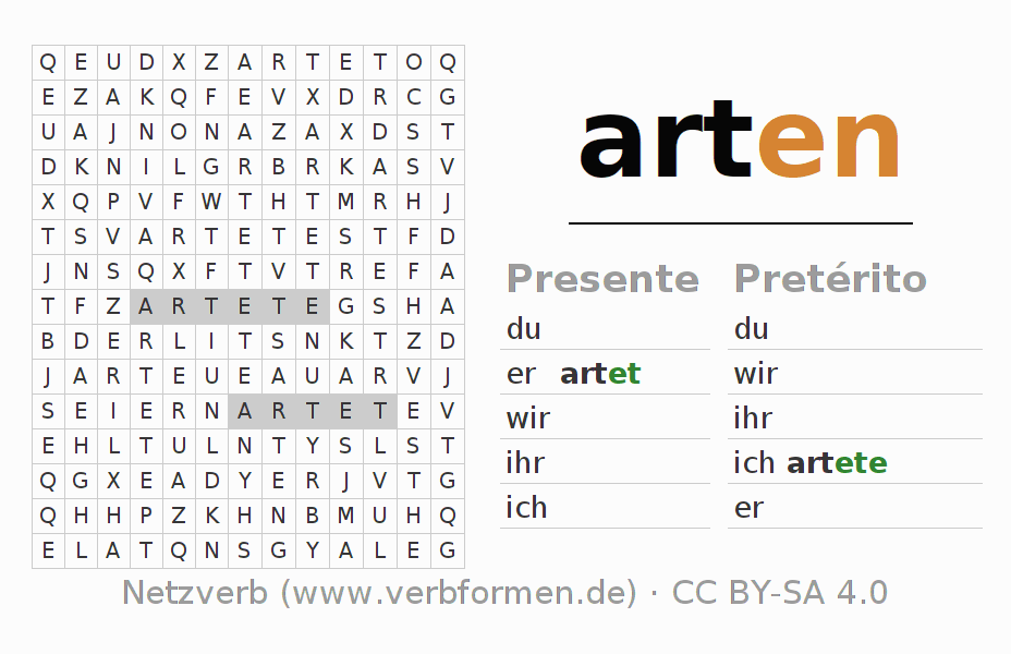 Instruções: reconhecer as formas verbais do verbo arten e encontrá-las no caça-palavras. Ou reconhecer a forma flexionada do verbo arten e atribuir a forma verbal correta. Trema e ß estão escritos como oe, ae, ue e ss.A solução encontra-se no final da página.