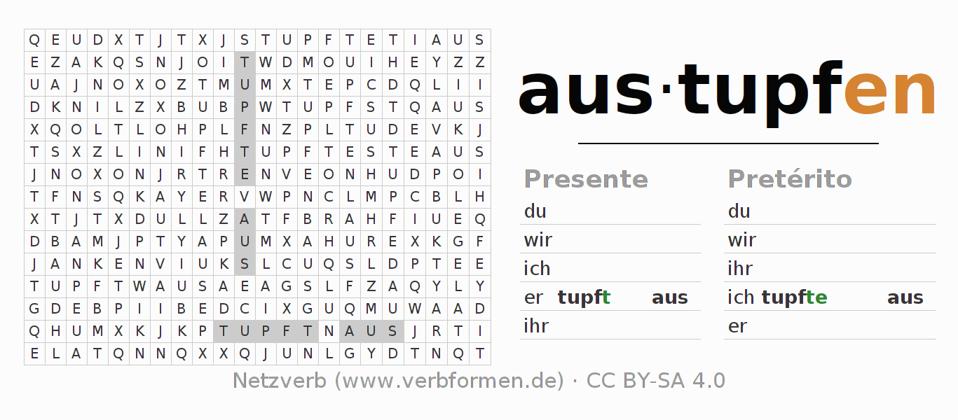Instruções: reconhecer as formas verbais do verbo austupfen e encontrá-las no caça-palavras. Ou reconhecer a forma flexionada do verbo austupfen e atribuir a forma verbal correta. Trema e ß estão escritos como oe, ae, ue e ss.A solução encontra-se no final da página.
