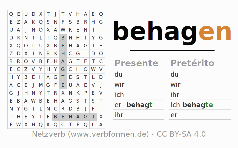 Solução do caça-palavras para a conjugação do verbo behagen