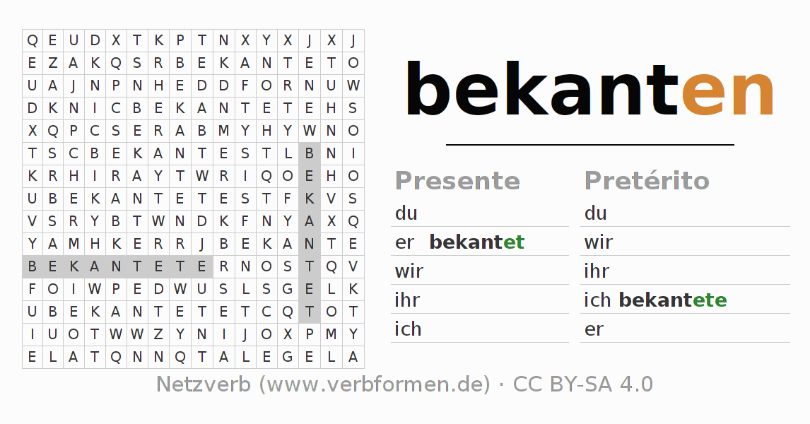 Solução do caça-palavras para a conjugação do verbo bekanten
