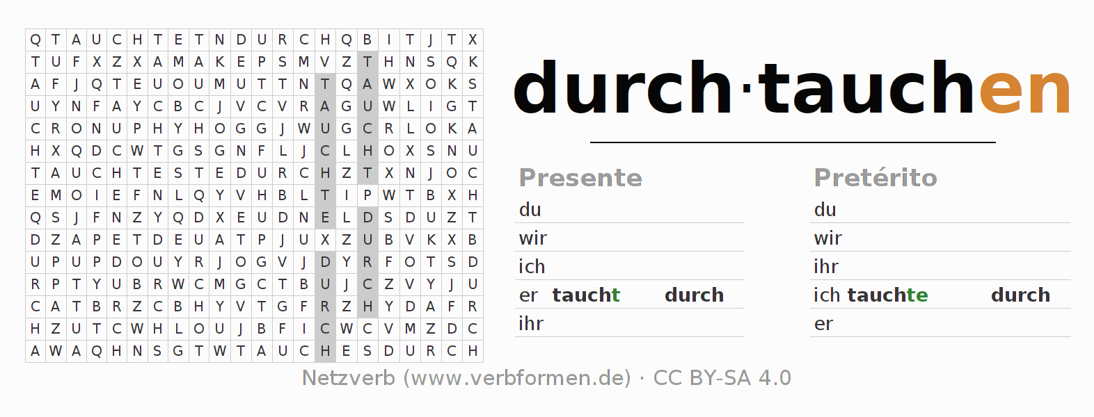 Solução do caça-palavras para a conjugação do verbo durchtauchen