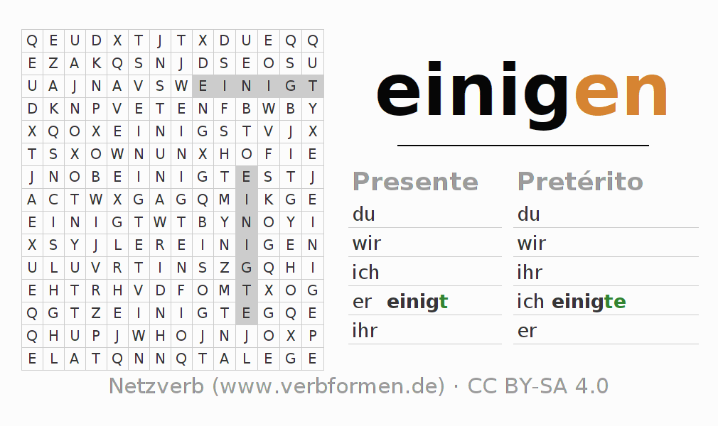 Solução do caça-palavras para a conjugação do verbo einigen