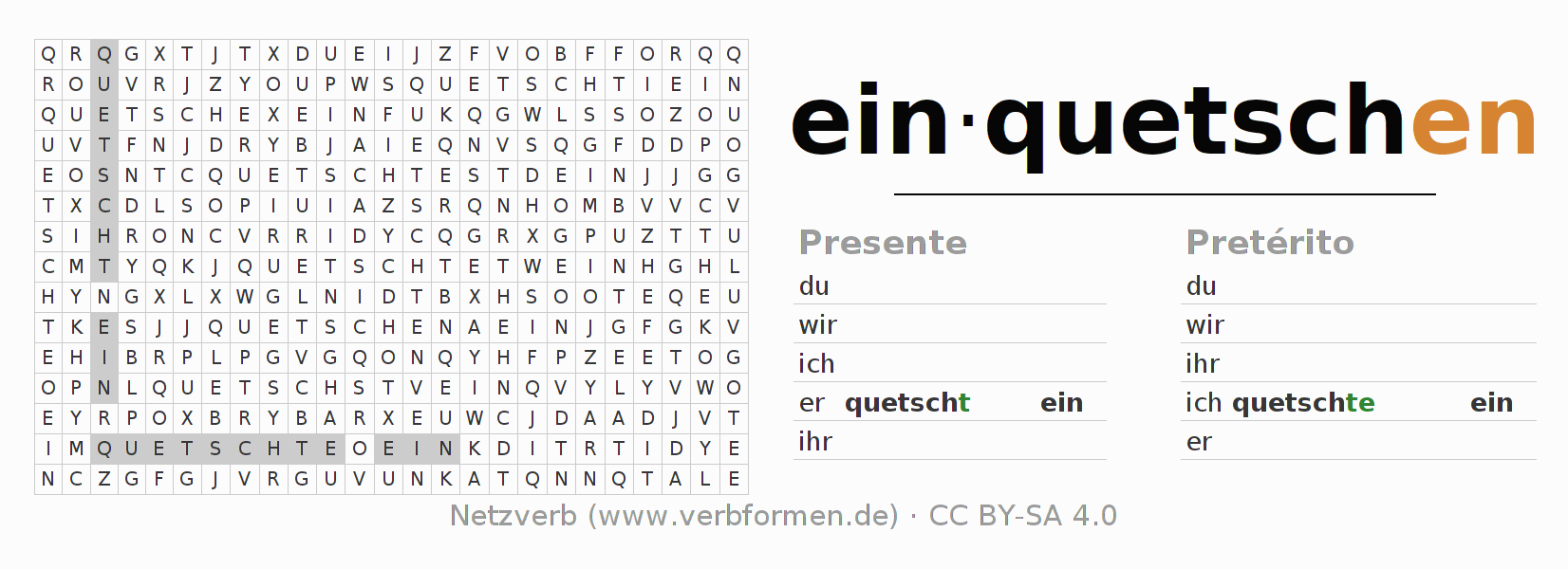Solução do caça-palavras para a conjugação do verbo einquetschen