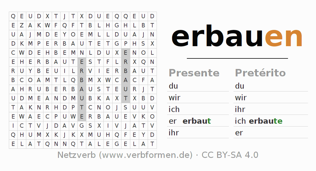 Solução do caça-palavras para a conjugação do verbo erbauen