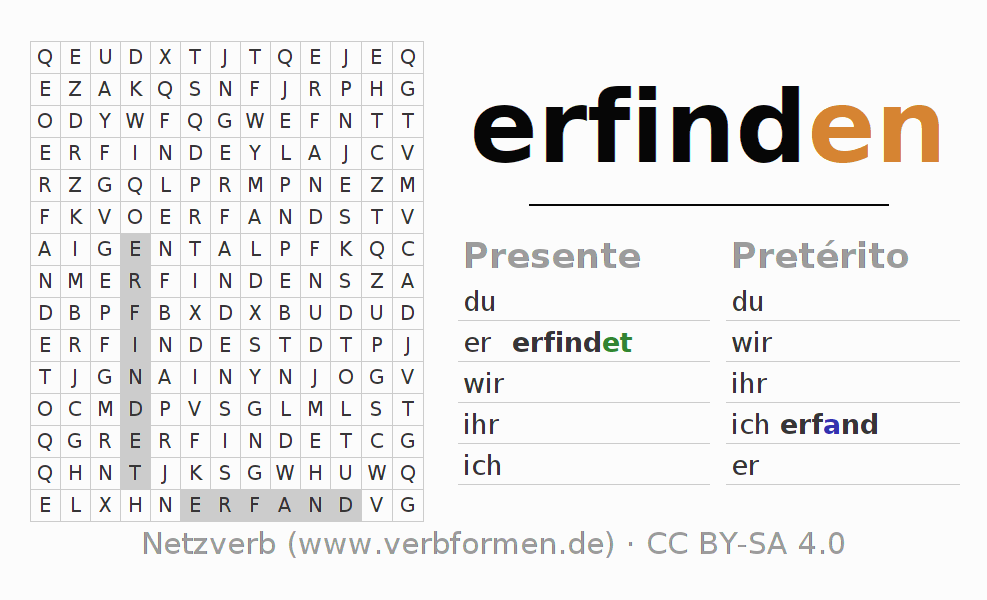 Solução do caça-palavras para a conjugação do verbo erfinden