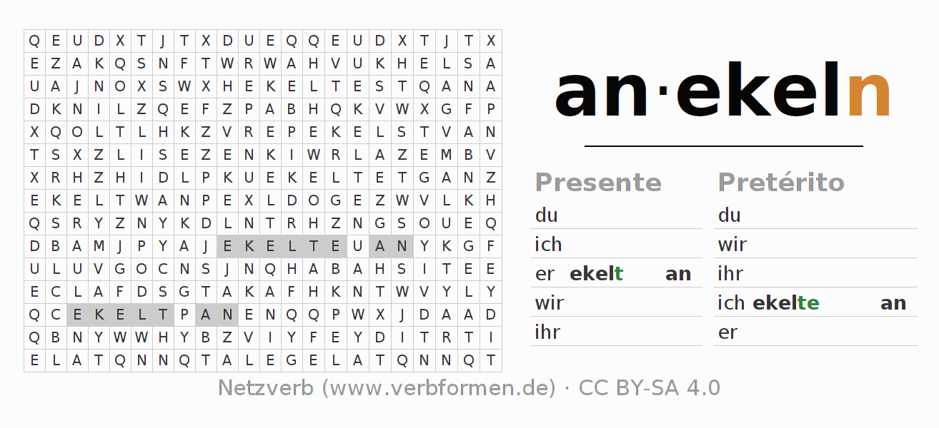 Instruções: reconhecer as formas verbais do verbo anekeln e encontrá-las no caça-palavras. Ou reconhecer a forma flexionada do verbo anekeln e atribuir a forma verbal correta. Trema e ß estão escritos como oe, ae, ue e ss.A solução encontra-se no final da página.
