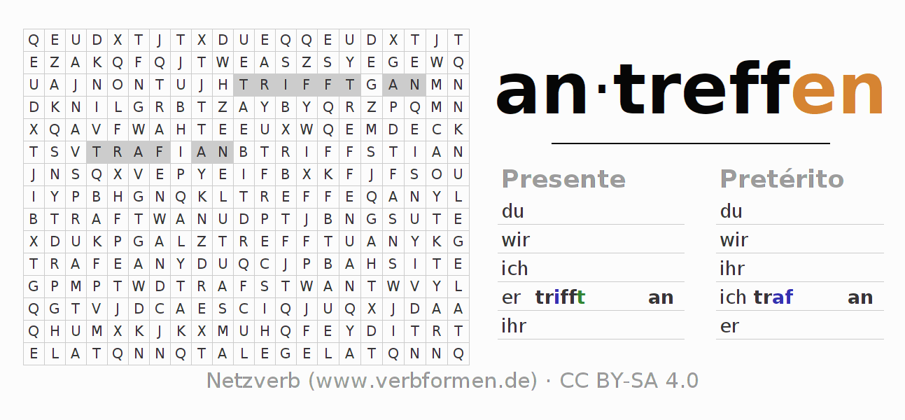 Solução do caça-palavras para a conjugação do verbo antreffen