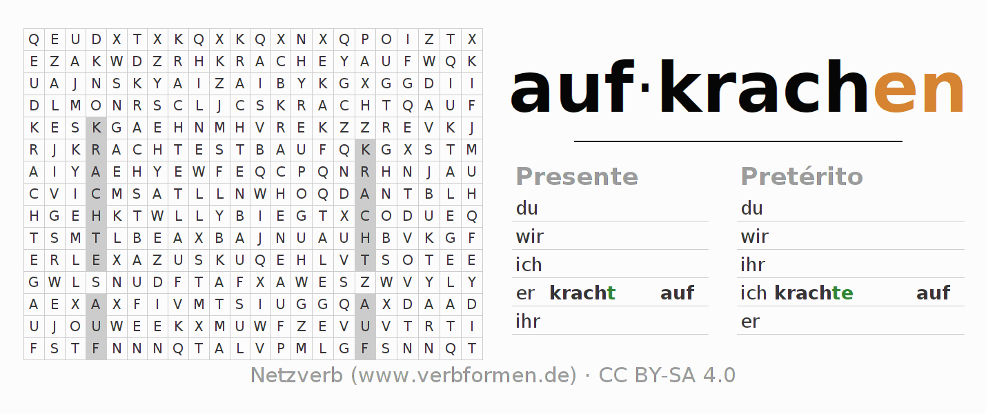 Instruções: reconhecer as formas verbais do verbo aufkrachen e encontrá-las no caça-palavras. Ou reconhecer a forma flexionada do verbo aufkrachen e atribuir a forma verbal correta. Trema e ß estão escritos como oe, ae, ue e ss.A solução encontra-se no final da página.