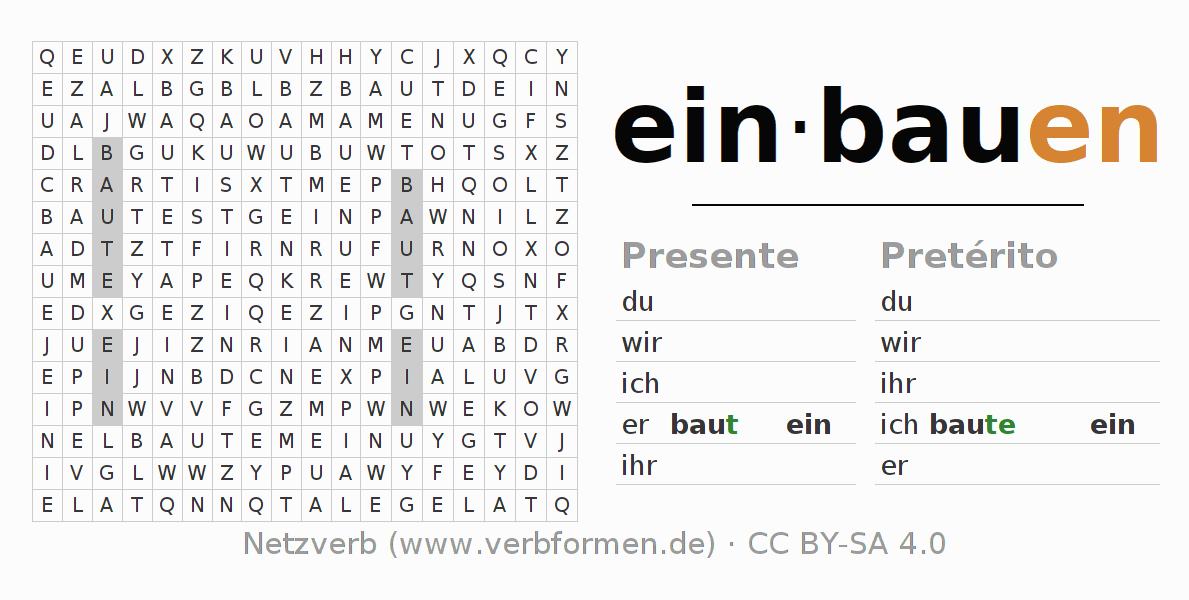 Solução do caça-palavras para a conjugação do verbo einbauen