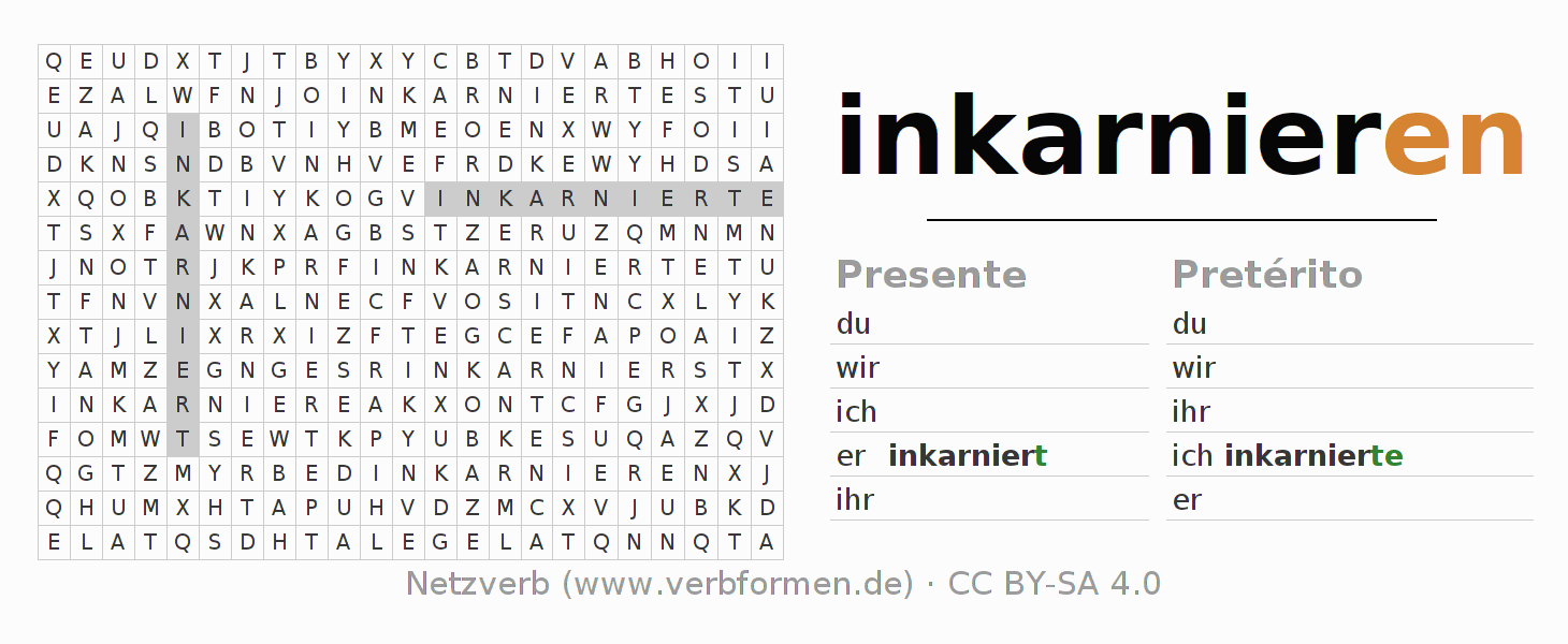 Solução do caça-palavras para a conjugação do verbo inkarnieren
