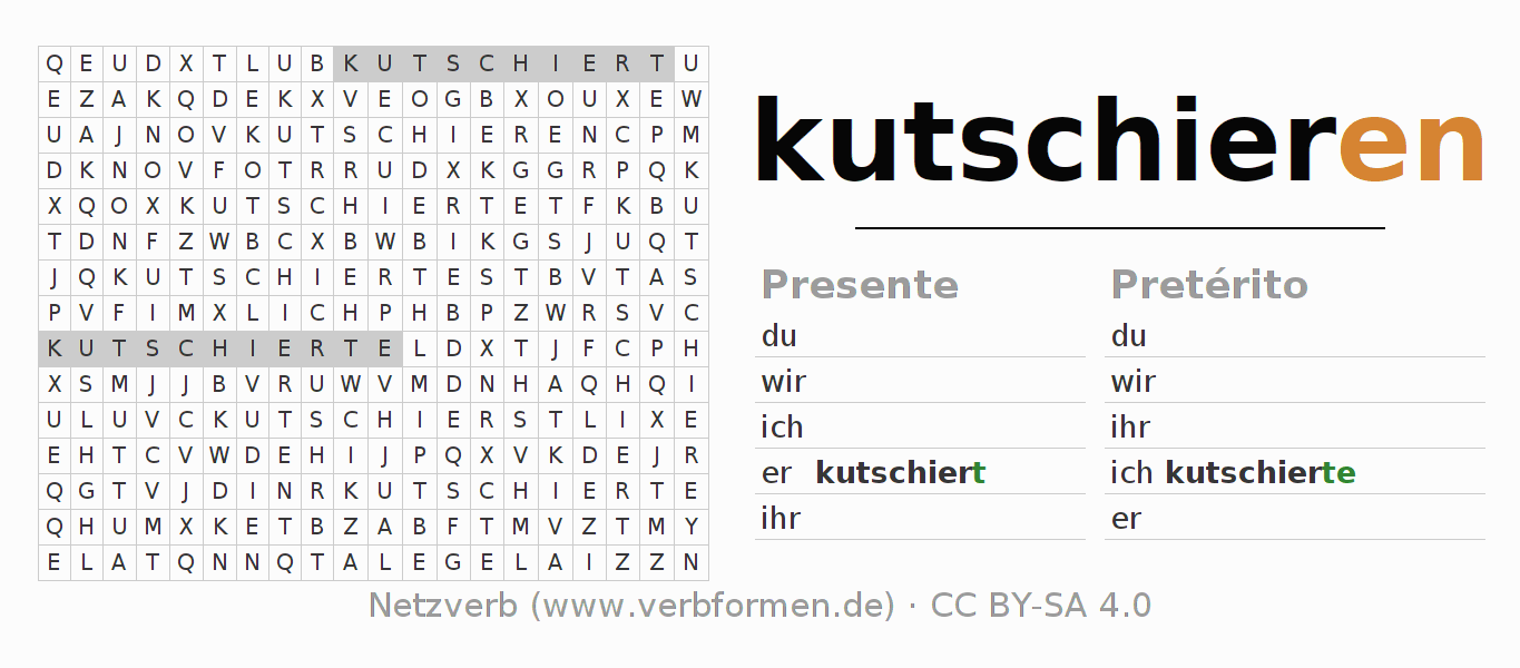 Instruções: reconhecer as formas verbais do verbo kutschieren e encontrá-las no caça-palavras. Ou reconhecer a forma flexionada do verbo kutschieren e atribuir a forma verbal correta. Trema e ß estão escritos como oe, ae, ue e ss.A solução encontra-se no final da página.