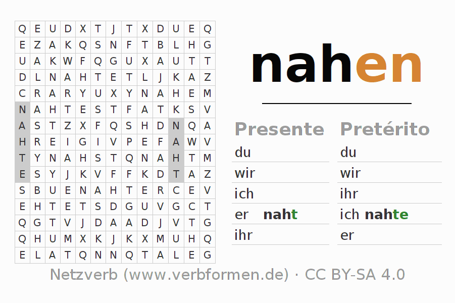 Instruções: reconhecer as formas verbais do verbo nahen e encontrá-las no caça-palavras. Ou reconhecer a forma flexionada do verbo nahen e atribuir a forma verbal correta. Trema e ß estão escritos como oe, ae, ue e ss.A solução encontra-se no final da página.