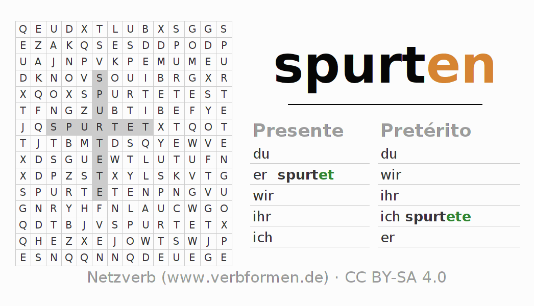 Instruções: reconhecer as formas verbais do verbo spurten e encontrá-las no caça-palavras. Ou reconhecer a forma flexionada do verbo spurten e atribuir a forma verbal correta. Trema e ß estão escritos como oe, ae, ue e ss.A solução encontra-se no final da página.