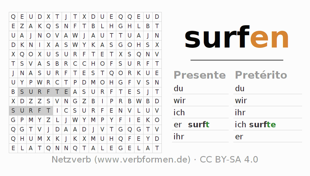 Instruções: reconhecer as formas verbais do verbo surfen e encontrá-las no caça-palavras. Ou reconhecer a forma flexionada do verbo surfen e atribuir a forma verbal correta. Trema e ß estão escritos como oe, ae, ue e ss.A solução encontra-se no final da página.