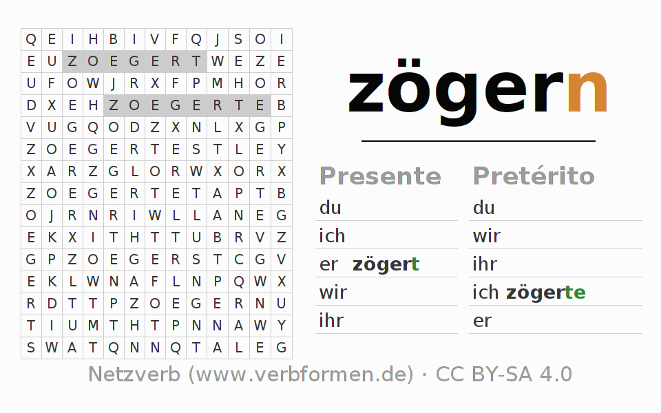 Instruções: reconhecer as formas verbais do verbo zögern e encontrá-las no caça-palavras. Ou reconhecer a forma flexionada do verbo zögern e atribuir a forma verbal correta. Trema e ß estão escritos como oe, ae, ue e ss.A solução encontra-se no final da página.