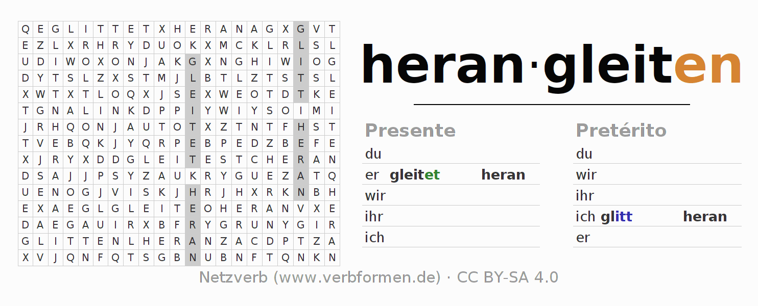 Solução do caça-palavras para a conjugação do verbo herangleiten
