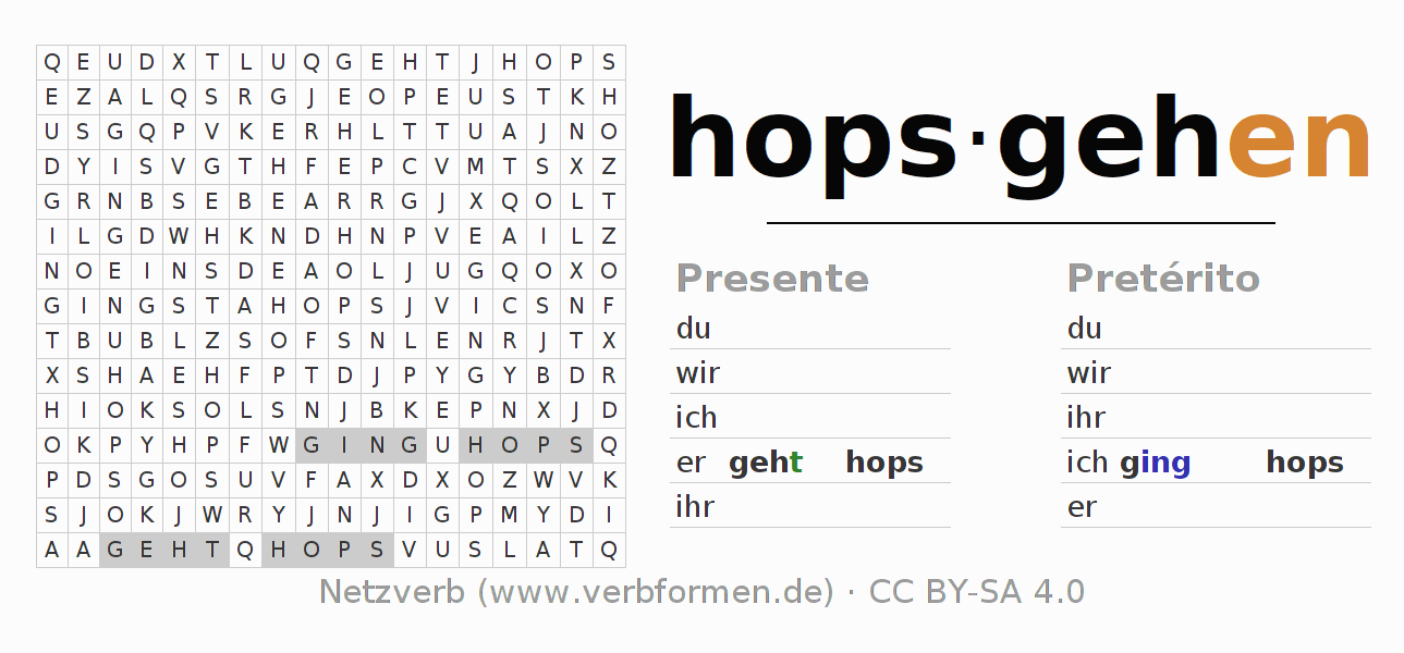 Solução do caça-palavras para a conjugação do verbo hopsgehen